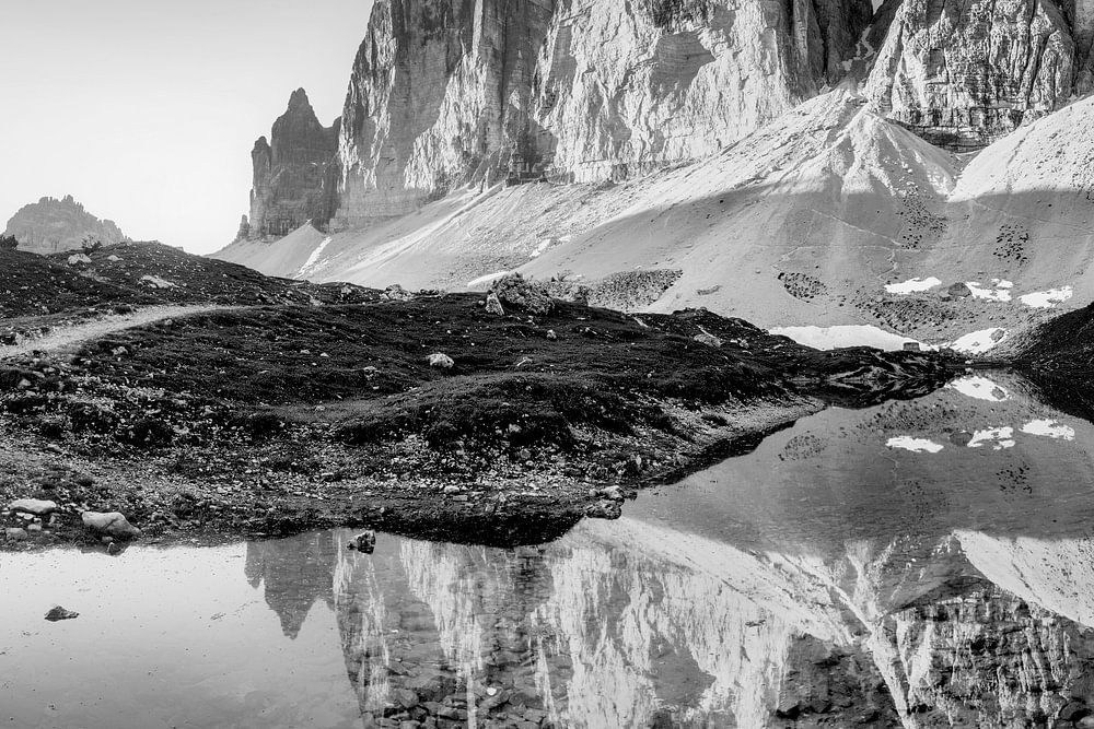 Le matin, au lever du soleil, au pied des Trois Cimets dans les Dolomites en Italie, en noir et blanc.
