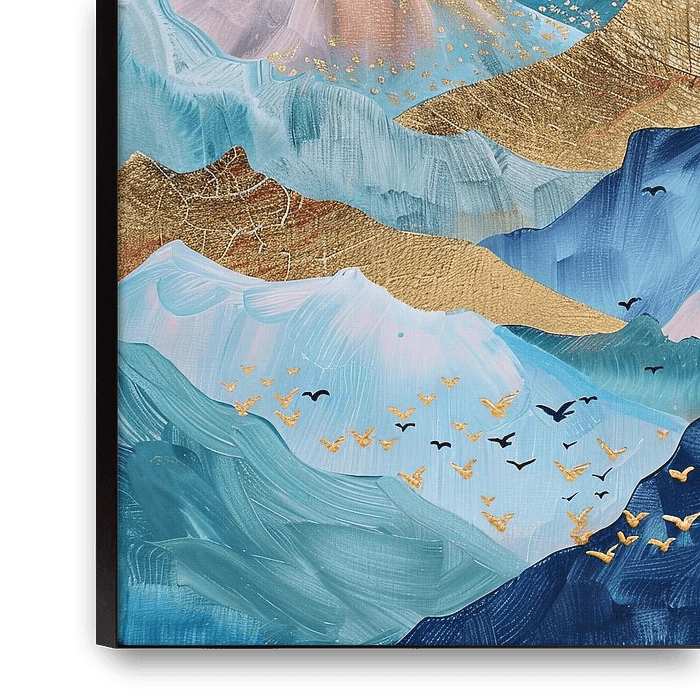 Ces œuvres d'art époustouflantes capturent la beauté d'un paysage de rêve où dominent les collines dorées et les douces couleurs pastel. Les lignes fluides et la palette harmonieuse de bleu, rose et or créent une atmosphère paisible et méditative. Les accents délicats de la feuille d'or donnent aux collines un éclat et une profondeur…