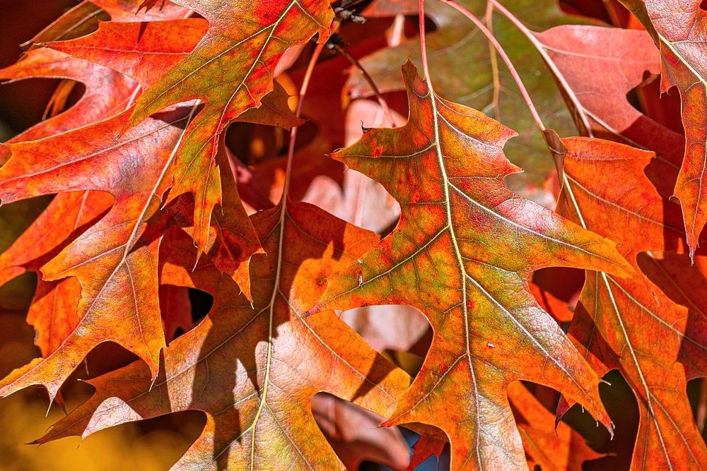 L'image montre un bouquet de feuilles dans la lumière éclatante de l'automne, dont les couleurs vont du rouge profond à l'orange et à l'or éclatants.