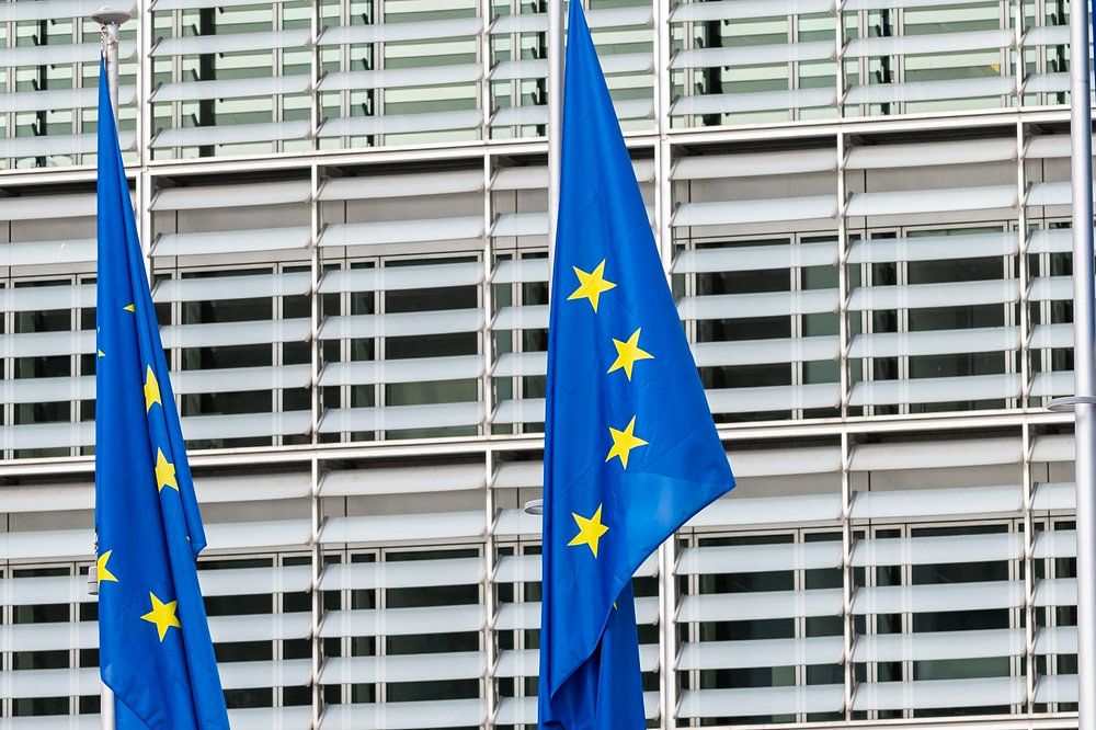 Une image symbole du quartier européen de Bruxelles : les trois drapeaux de l'Europe avec le bâtiment du Berlaymont en arrière-plan - idéal si vous voulez présenter les nouvelles vous-même à la maison !