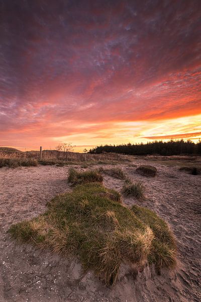 Un grand spectacle de couleurs ce matin dans les dunes près de Petten (Hollande du Nord). Le soleil levant illumine les nuages présents. Les touffes d'ammophile et le sable de la plage du lac Het Korfwater servent de premier plan.