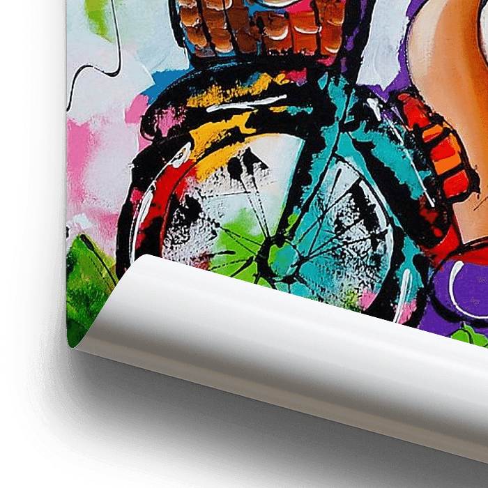 Achetez cette œuvre d'art abstraite Les grosses dames à vélo par Vrolijk Schilderij sur toile, aluminium, ArtFrame ou photographie (encadrée), impression d'art en haute qualité et tout format.