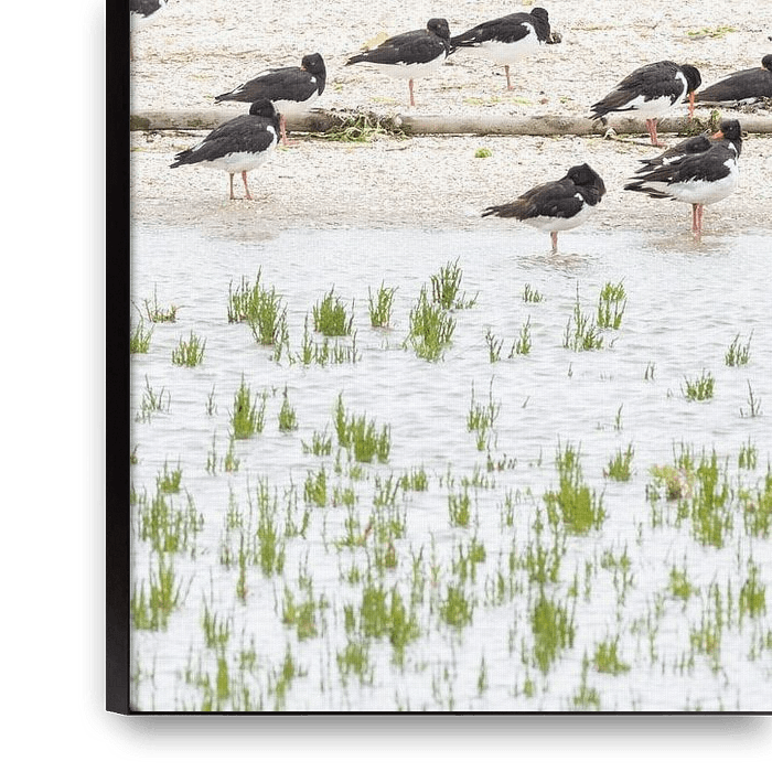 Huîtriers-pie se reposant sur une vasière sèche au large de la côte d'Ameland, avec des salicornes au premier plan. J'ai pris cette photo depuis la digue de la vasière.