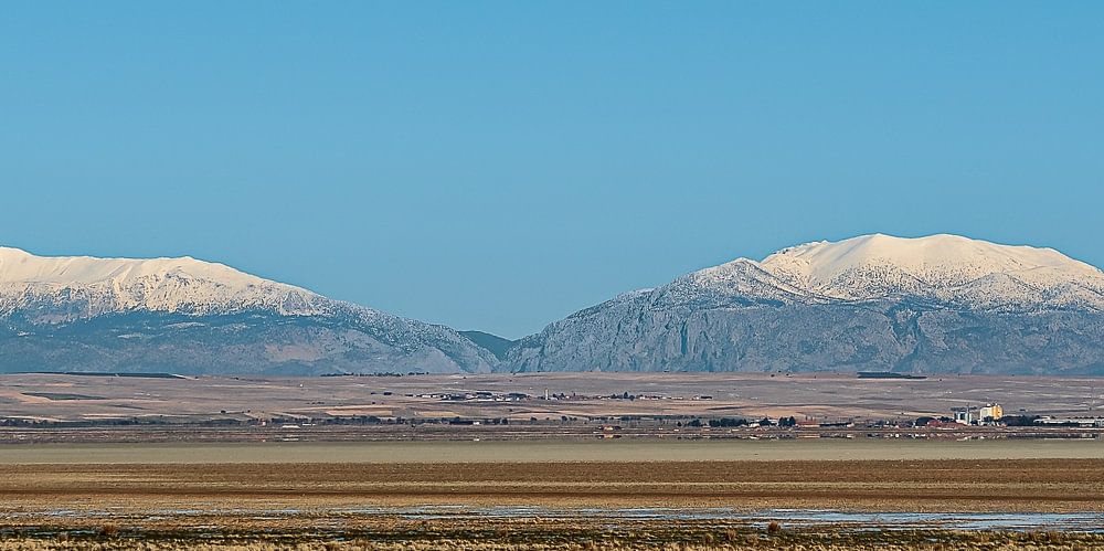 Les lacs salés d'Afyonkarahisar avec les sommets enneigés des montagnes en arrière-plan.
