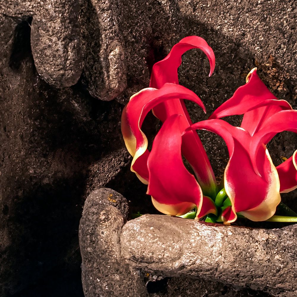 Une fleur de Gloriosa rouge dans les mains usées par les intempéries d'une statue de Bouddha sculptée dans la pierre.