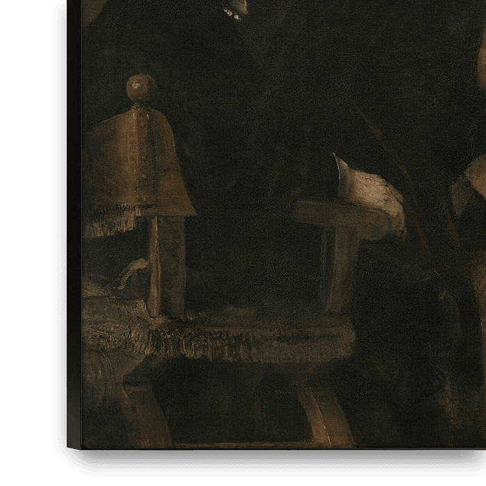 Les dignes de la guilde des drapiers d'Amsterdam, connus sous le nom de "maîtres de l'acier", Rembrandt Harmensz. van Rijn, 1662 Il s'agit de la première et unique pièce de régent de Rembrandt. Il se distingue par sa taille exceptionnelle et ses figures plus grandes que nature. Les yeux de tous les maîtres de l'acier ? qui vérifiaient la qualité des tissus colorés ? sont sur nous. L'un d'eux s'est brièvement levé de sa chaise, comme s'il venait de nous remarquer. En raison du point d'observation bas, la table semble dépasser le plan de l'image.