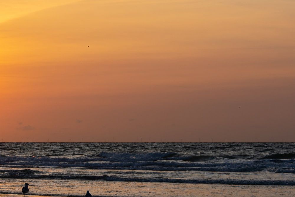 Ces mouettes sont au bord de l'eau et regardent le coucher du soleil à Oostkapelle. La plage d'Oostkapelle est située dans une réserve naturelle bien connue de la Zélande. Il existe de nombreuses possibilités de loisirs.
