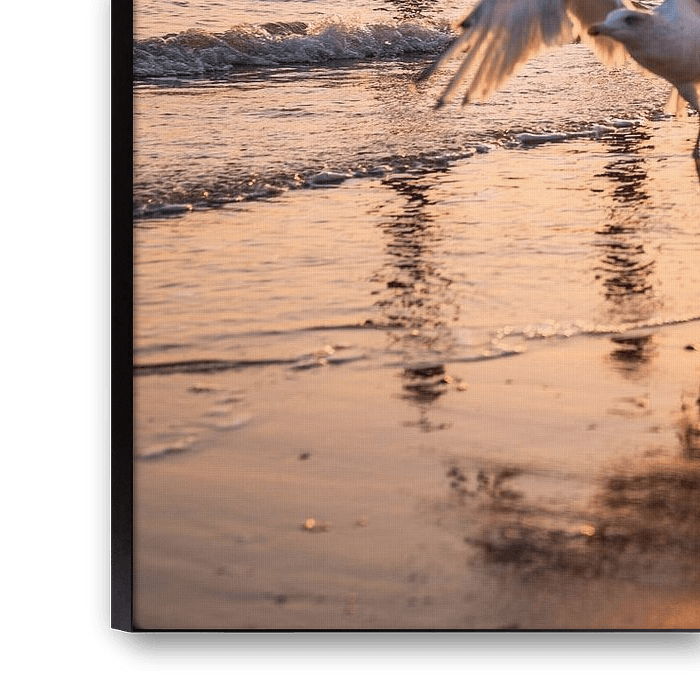 Cette charmante photographie couleur de Flushing capture une scène vivante de mouettes volant et se perchant sur une rangée de pieux de plage couverts de balanes, alors que le soleil est bas sur l'horizon. La lumière dorée du soleil se reflète sur le sable mouillé et l'eau ondulante, créant une lueur chaude et rêveuse. La combinaison du mouvement, de la lumière et du calme naturel fait de cette image une représentation puissante de la vie dynamique sur la côte néerlandaise lors d'une soirée ensoleillée.