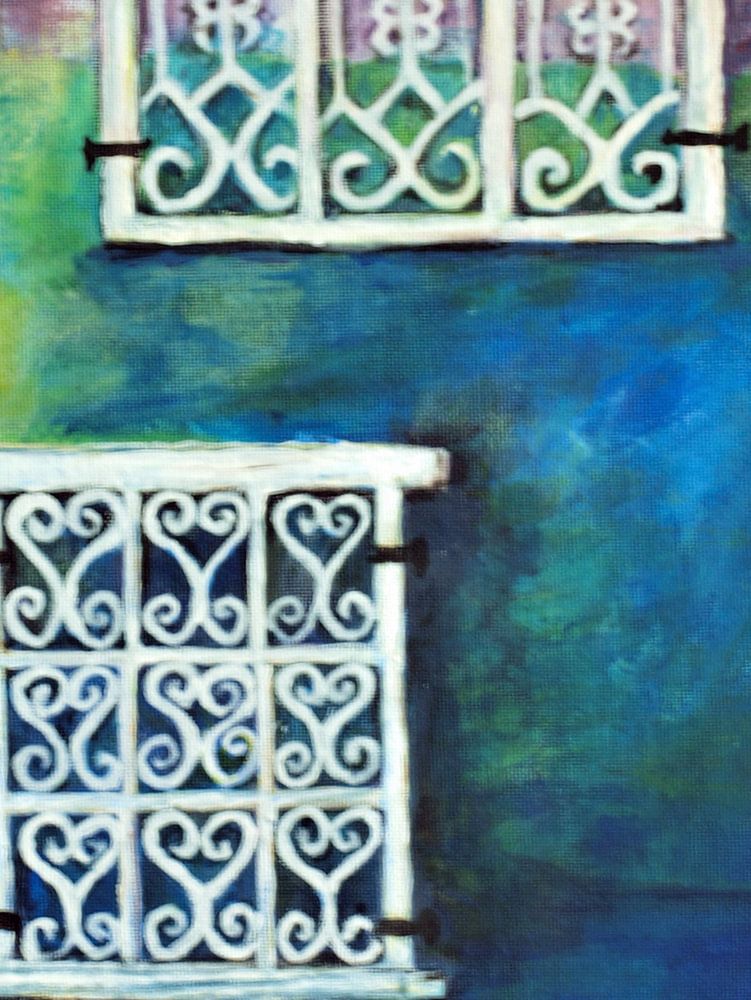 Les couleurs des murs avec les fenêtres blanches à barreaux donnent une impression de conte de fées. Que se passerait-il derrière ces fenêtres ? Ce sont des secrets qui sont gardés. Un tableau peint dans les couleurs vives. Les fenêtres blanches barrées contrastent fortement avec les couleurs.