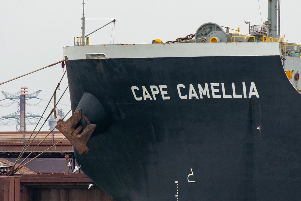 Les rameurs sont à pied d'œuvre pour amarrer un grand navire de haute mer à un terminal de vrac à Europoort. Avec leur canot pneumatique, ils sont près de la proue du gigantesque vraquier, prêts à transférer les lourdes amarres. À bord, les hommes s'affairent à attacher les énormes amarres, tandis que les rameurs aident le navire à s'amarrer au quai.