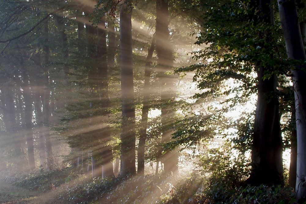 Lorsque l'automne commence, les rayons du soleil et le brouillard évoquent les plus belles images de la nature. Le soleil se fraie un chemin à travers les arbres. En arrière-plan, vous pouvez voir le paysage brumeux.