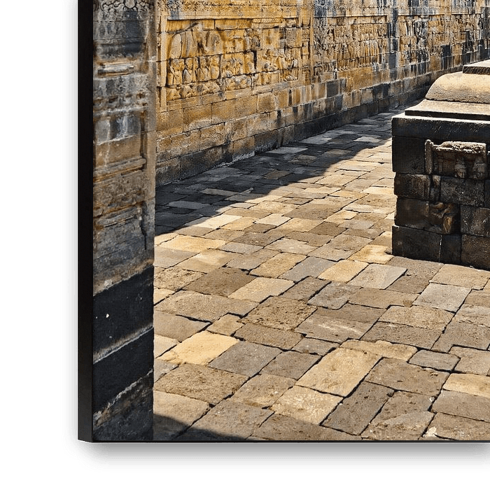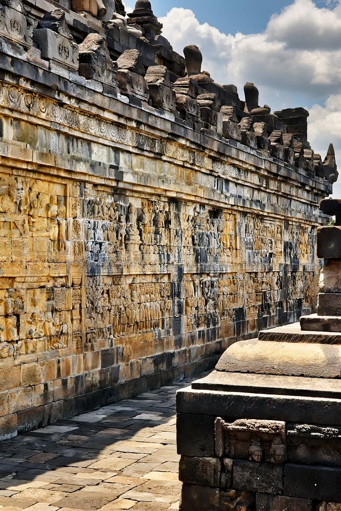 Sous un ciel où alternent nuages et lumière, les galeries du temple de Borobudur révèlent leurs magnifiques bas-reliefs, finement sculptés dans la pierre volcanique. Chaque panneau raconte un épisode de la vie du Bouddha, une leçon morale ou une scène de la vie quotidienne de l’ancienne Java.