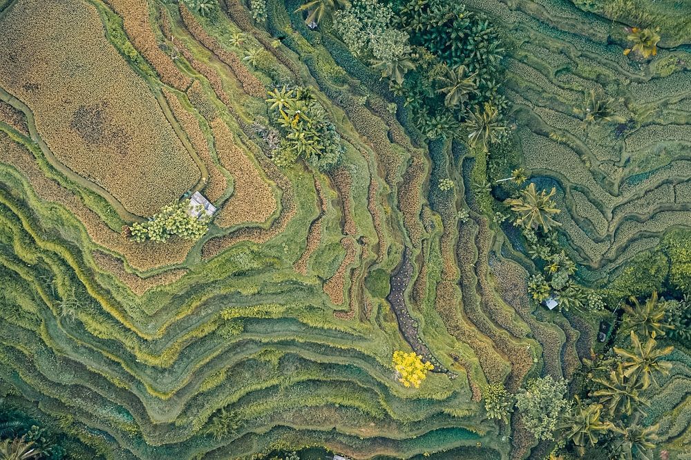 Ces collines en terrasse sont parmi les plus photographiées de Bali. Il peut donc être très fréquenté pendant la journée. Vous avez moins de chances de voir les rizières depuis les airs, comme sur cette photo. La photo prise par le drone a été prise avant le lever du soleil, alors que c'était encore très calme. Quelques agriculteurs, mais pas encore un touriste en vue.