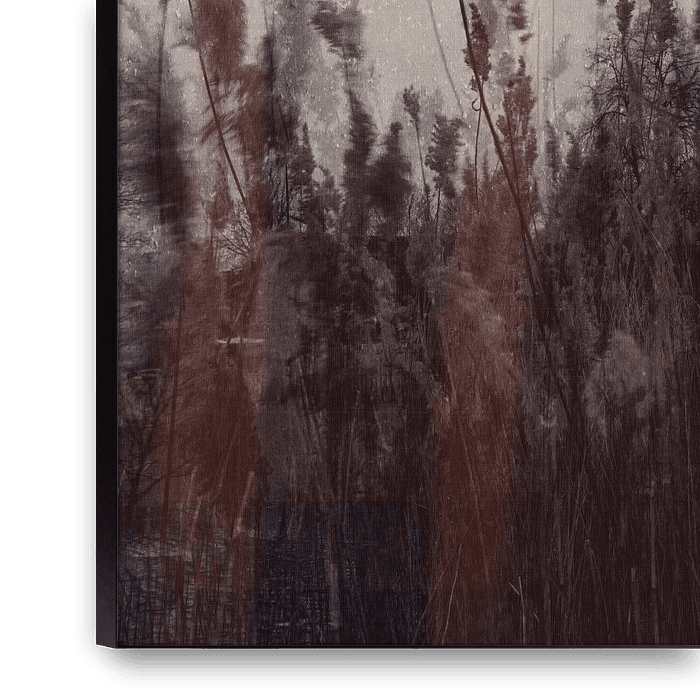 Une image de roseaux se déplaçant doucement dans le vent d'hiver, créant une atmosphère sereine sous le ciel d'hiver. Cette œuvre d'art mixte présente des tons sombres. Elle a été créée à l'aide d'expositions multiples dans l'appareil photo et présente de subtils coups de pinceau de couleur pêche.