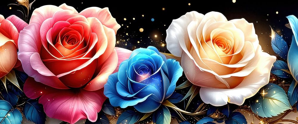 Dans ce panorama impressionnant, la force symbolique intemporelle de la rose se déploie dans une composition qui fait fusionner la couleur, la forme et la lumière en une unité poétique. Cinq roses luxuriantes - d'un rouge profond, d'un rose éclatant, d'un blanc délicat et de deux nuances de bleu - se blottissent les unes contre les autres, comme si elles se rencontraient dans un dialogue silencieux. Leur interaction donne l'impression d'une harmonie florale faite d'émotion et de silence.