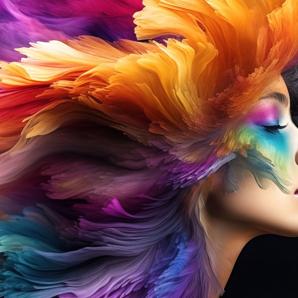 Portrait expressif et coloré d'une femme avec une aura de panaches de fumée aux couleurs vives.