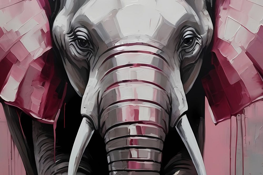 Cette œuvre d'art puissante associe la beauté majestueuse d'un éléphant à une touche contemporaine, en fusionnant des nuances de gris, de blanc et de noir avec des accents roses frappants. Il s'agit d'une interprétation moderne d'un animal intemporel, où les grandes oreilles et les défenses jouent un rôle prépondérant. Les taches de peinture rose lui confèrent une touche à la fois ludique et artistique, ce qui en fait un complément idéal pour un salon ou une salle à manger contemporains. Les traits dynamiques et la combinaison de couleurs modernes font de ce motif une œuvre d'art frappante et discutable qui célèbre la puissance et la majesté du monde naturel.