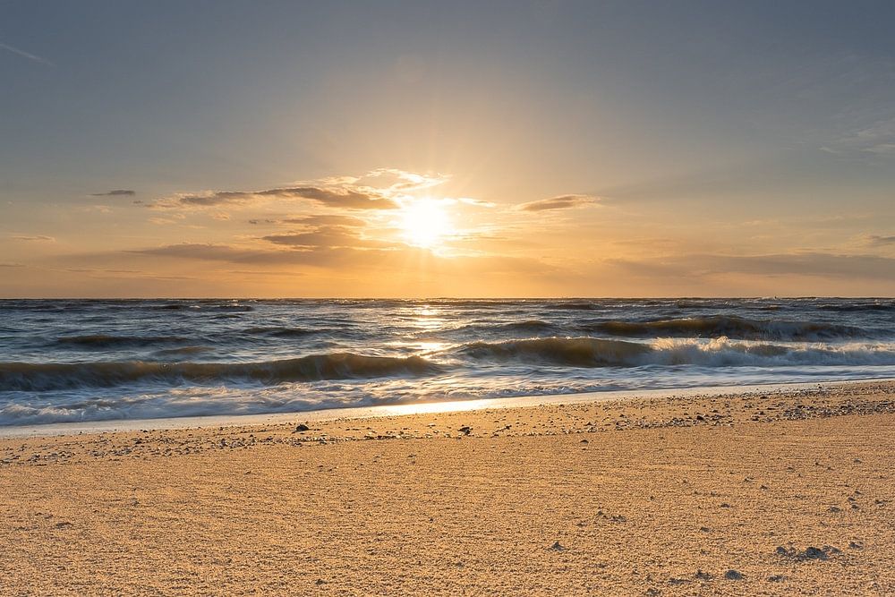 La côte néerlandaise au coucher du soleil, de belles soirées d'été et de belles plages. Ciel bleu intense avec une petite couverture nuageuse pour le soleil couchant. Mer bleue calme glissant contre la côte sur le beau sable doux.