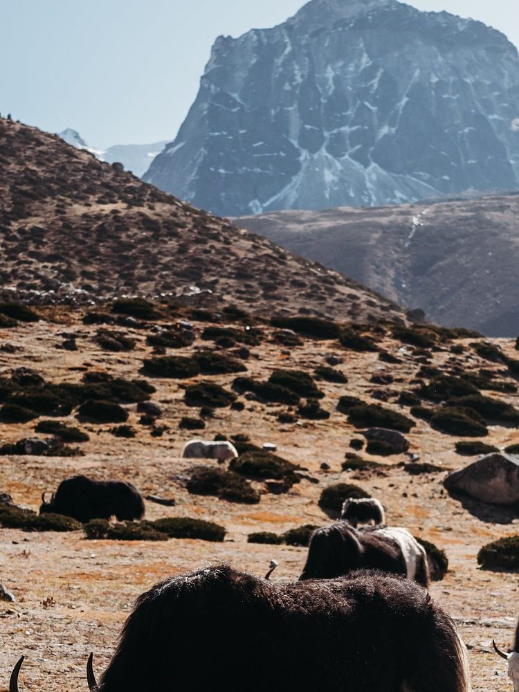 Des yaks avec leurs petits paissent dans les montagnes de l'Himalaya au Népal. Nous les avons rencontrés lors d'un trekking dans la région de l'Everest.