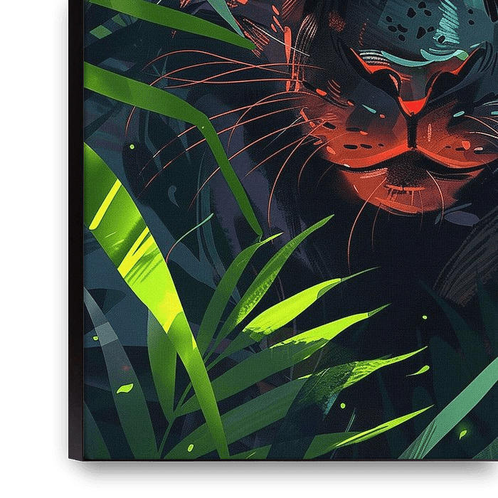 Une puissante panthère noire émerge des ombres denses de la jungle, illuminée par des reflets dramatiques et des coups de pinceau vibrants. Le regard intense et les couleurs riches créent une œuvre d'art audacieuse et cinématographique, pleine de mystère et de force.
