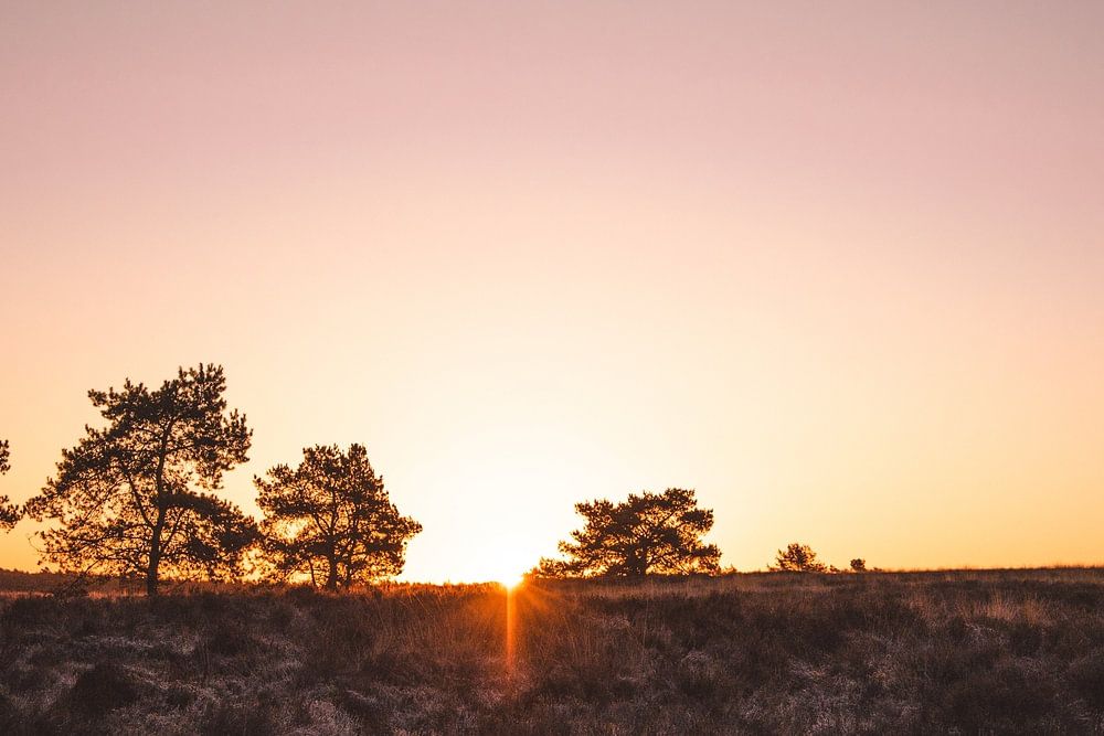 Kroondomein het Loo, près d'Apeldoorn, comprend le parc du palais (près de Paleis het Loo et du vieux château) et les bois et landes environnants. C'est un endroit agréable pour se promener, et vous pouvez entrer dans la zone dès que le soleil se lève, et j'étais là exactement à ce moment-là. Au bord de la lande De Vosselt, j'ai assisté aux premières minutes du lever du soleil. Quel moment merveilleux et magique que celui où la journée s'offre encore à vous comme un cadeau. Vous n'avez aucune idée de ce qu'il vous apportera et des nouveaux souvenirs que vous créerez.