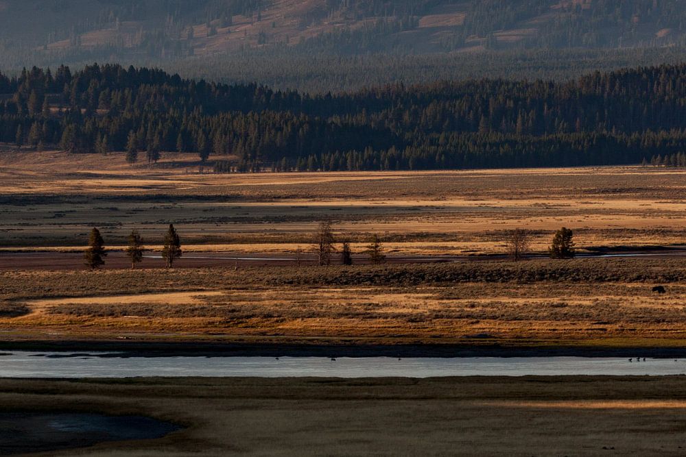 Une photographie en couches du lever du soleil dans le parc national de Yellowstone. La lumière met en valeur les différentes couches, l'eau, l'herbe, les montagnes, les arbres.