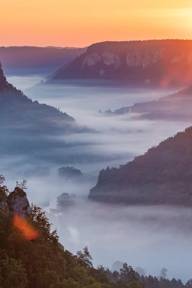 Vallée du Danube supérieur près du château de Werenwag dans le parc naturel du Danube supérieur près de Beuron au lever du soleil, Jura souabe, Bade-Wurtemberg, Allemagne.