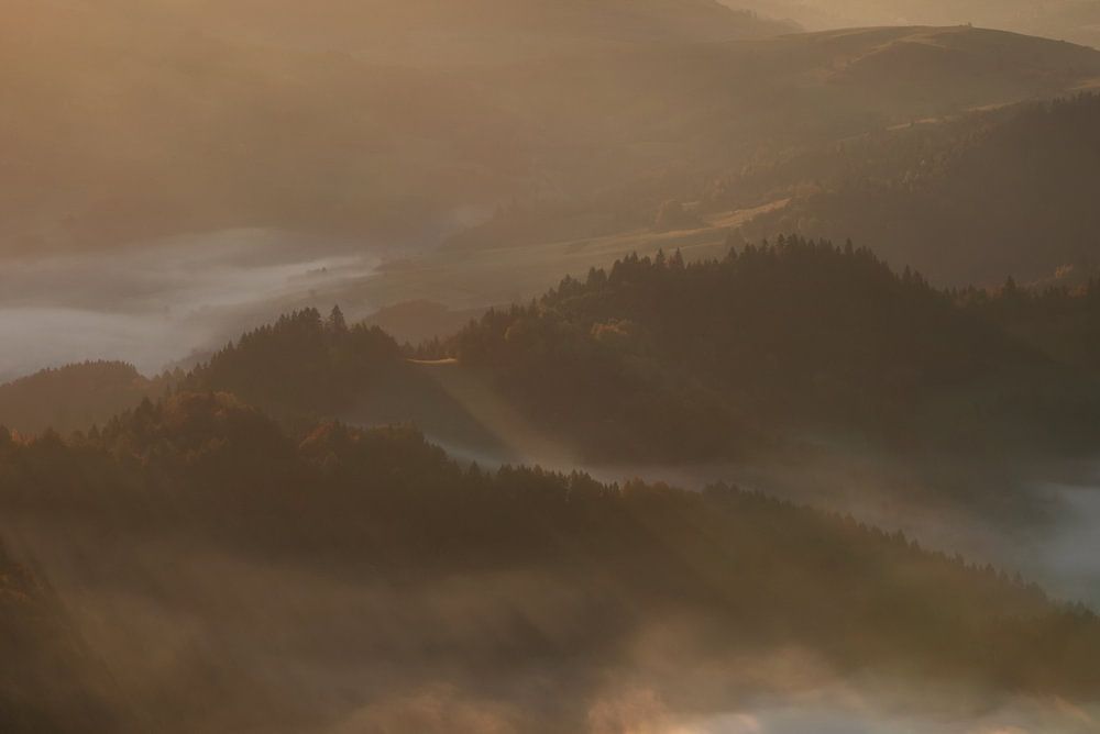 Brouillard dans les montagnes des Pieniny au lever du soleil, Pologne