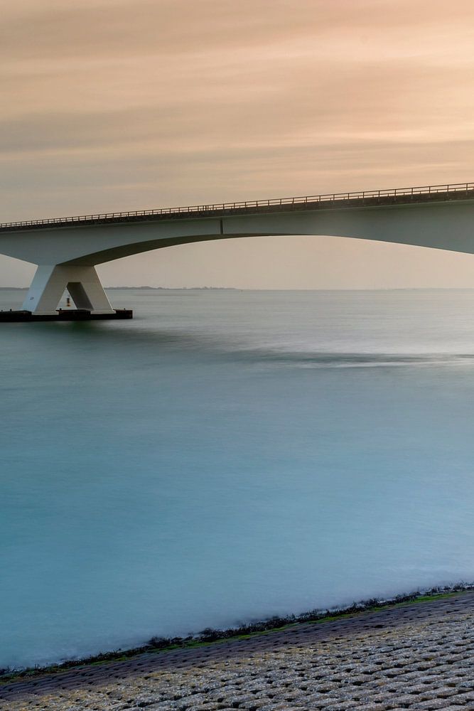 Lever de soleil derrière le pont de Zeeland, le plus long pont des Pays-Bas, dans la province de Zeeland.