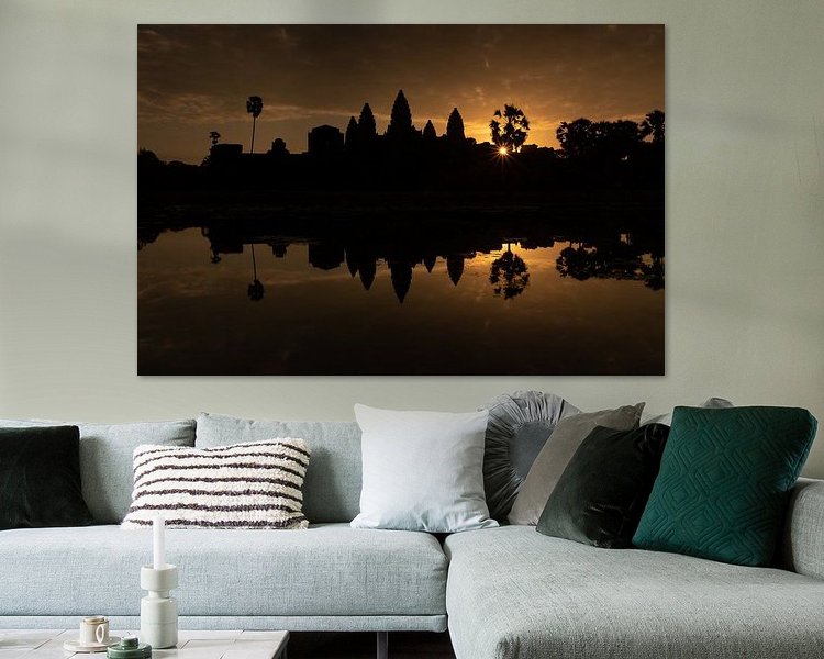 Beau lever de soleil au temple d'Angkor Vat, le plus grand temple du complexe du temple d'Angkor Vat à Siem Reap, au Cambodge. Le soleil levant s'alignait parfaitement sur le palmier emblématique et l'étang de réflexion était calme et reflétait parfaitement le paysage. Je devais m'assurer d'y arriver vers 5 heures du matin pour obtenir un bon endroit pour photographier.