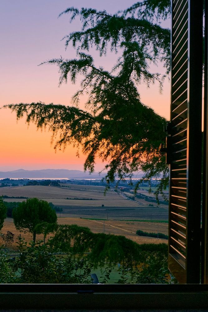 Lever de soleil depuis l'authentique chambre à coucher de Casa la Terrazza en Ombrie. Le regard se porte sur la région qui borde directement la Toscane et, au loin, on aperçoit le lac Trasimène, Lago Trasimeno. Prise au petit matin d'une chaude journée d'été, cette photo a été prise alors que le soleil n'était pas encore levé mais qu'il donnait déjà au ciel une belle lueur orangée. Encore une belle journée en Italie