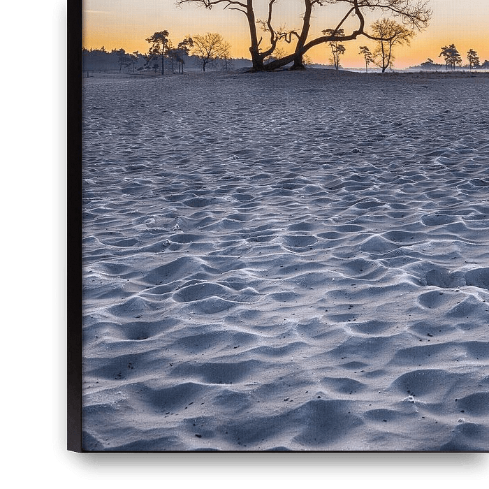 La couche supérieure du sable est gelée et devient blanche en conséquence. Les arbres sont un autre beau sujet dans le magnifique paysage néerlandais.