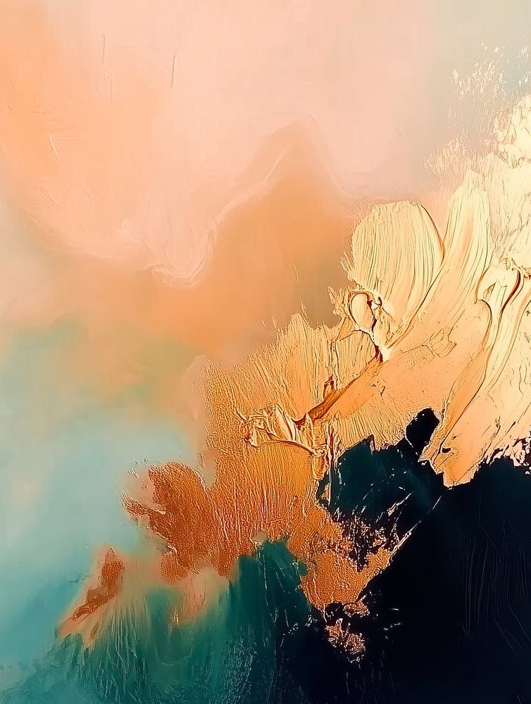 Cette peinture abstraite évoque une atmosphère de rêve grâce à un équilibre parfait entre les tons chauds et froids. Au centre de l'œuvre, de douces nuances d'or, d'orange et de rose se fondent les unes dans les autres, reflétant la chaleur et la tranquillité d'un coucher de soleil ou d'une lumière éclatante. Vers les bords, ces couleurs vibrantes s'estompent subtilement pour laisser place à des tons sourds de vert, de bleu et de gris, donnant à la peinture une profondeur et une qualité presque atmosphérique.