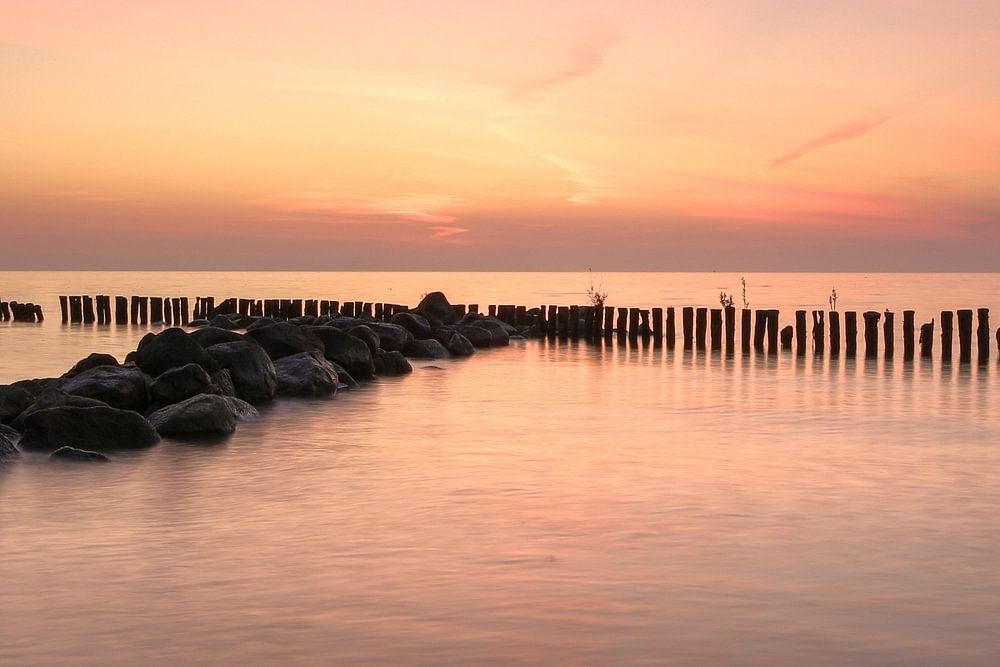 Brise-lames dans l'IJsselmeer fait de blocs de rivière de l'ancien Zuiderzee près d'Enkhuizen.