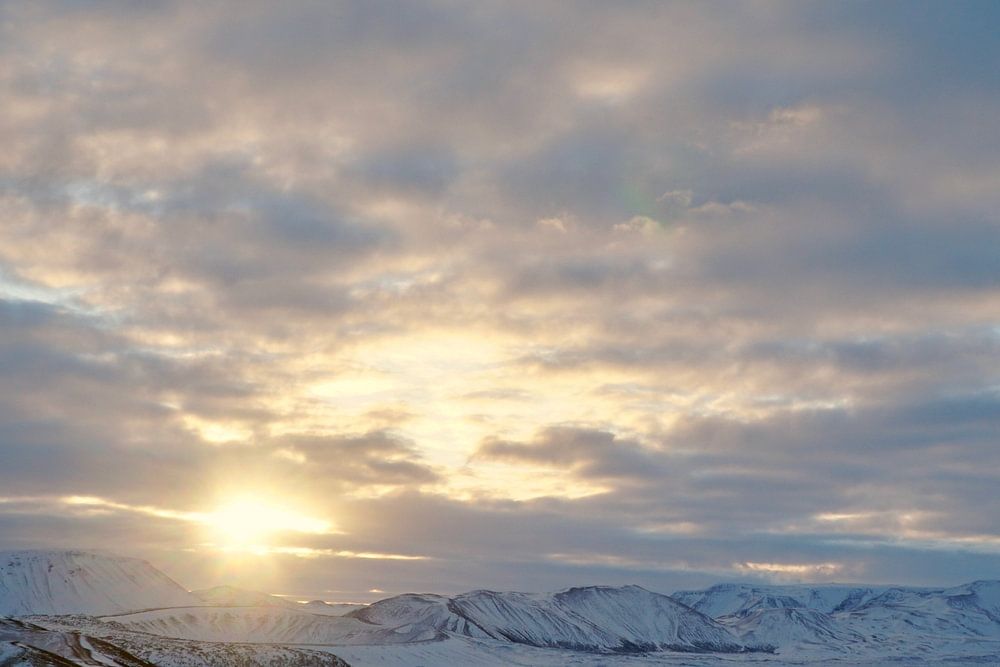 Tôt le matin, nous grimpons sur le cratère du volcan Hverfjall pour assister au lever du soleil sur le paysage islandais. Le soleil émerge à peine d'entre les nuages, donnant à ces derniers une magnifique lueur. Au premier plan, vous pouvez voir le bord noir du cratère.