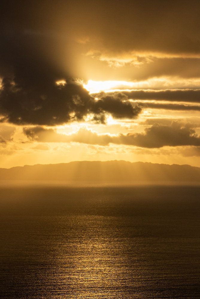 Paysage de nuages dramatique avec un lever de soleil doré depuis l'île de Madère, au Portugal. La mer ridée reflète les rayons dorés du soleil.