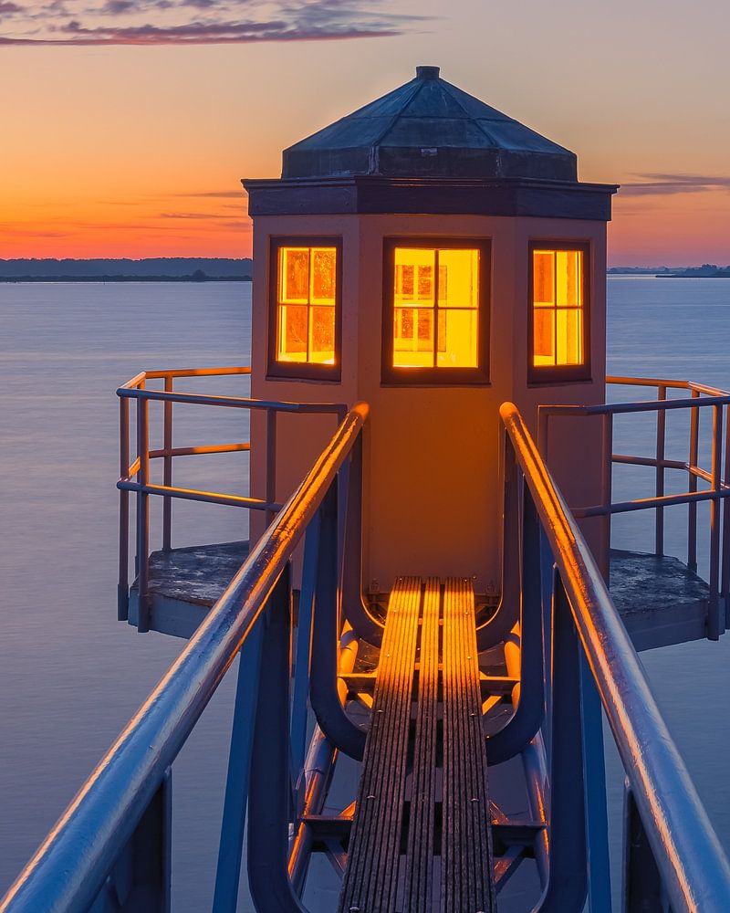 Une photo verticale 4:5 du lever du soleil d'été au phare d'Oostmahorn. L'appellation "phare" n'est toutefois pas appropriée, car il s'agit d'un "Peilschaal" (monument nautique), un point de mesure du niveau de l'eau sur la Lauwersmeer.