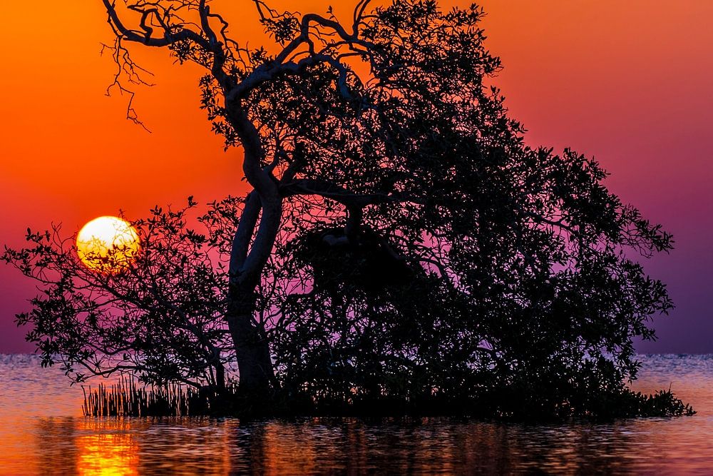 Un lever de soleil très lumineux et coloré en Égypte. Voici la mer Rouge au petit matin. Chaque jour, le soleil se lève avec de belles couleurs, mais ce n'est pas tous les jours qu'il est aussi spectaculaire que sur cette image. Les couleurs sont tout simplement incroyables. Les couleurs orange, jaune, rose, violet, bleu et pêche se mélangent avec une grande douceur. On dirait une peinture. Le palétuvier donne à cette photo une belle composition. Le grand oiseau dans le ciel donne à cette photo plus d'émotion.
