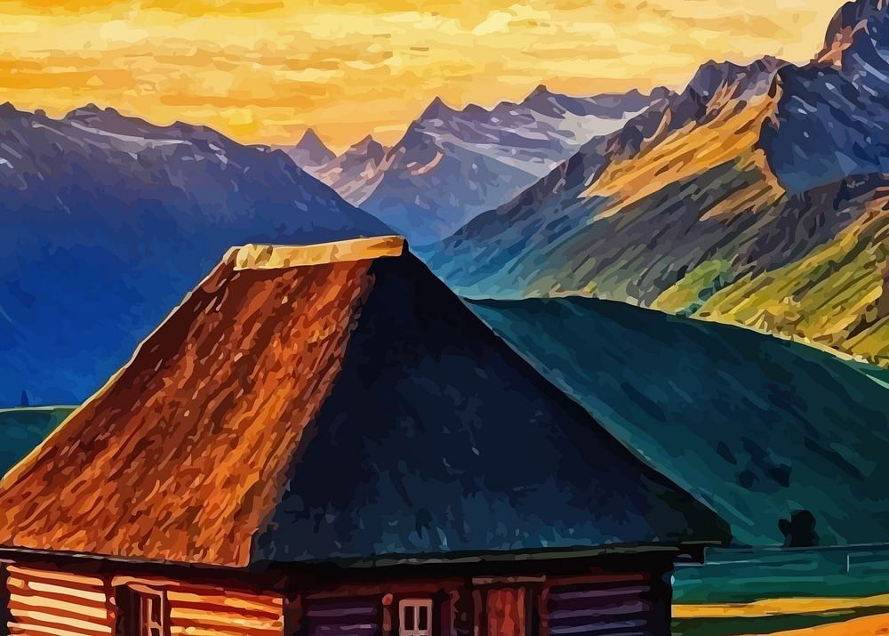 L'image montre un lever de soleil à couper le souffle sur la montagne Peitlerkofel au col du Würzjoch. Au premier plan, une cabane rustique en bois se dresse sur une prairie en pente douce, baignée par la lumière dorée du soleil. Le ciel est peint avec des teintes vibrantes d'orange, de rose et de bleu, tandis que les pics montagneux spectaculaires à l'arrière-plan ajoutent à l'atmosphère sereine et majestueuse de ce paysage alpin.