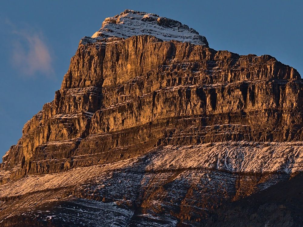 Vue du sommet baigné d'orange de la montagne escarpée Pilot Mountain dans les Rocheuses canadiennes, sous le soleil matinal d'automne après le lever du soleil dans le parc national de Banff, Alberta, Canada.