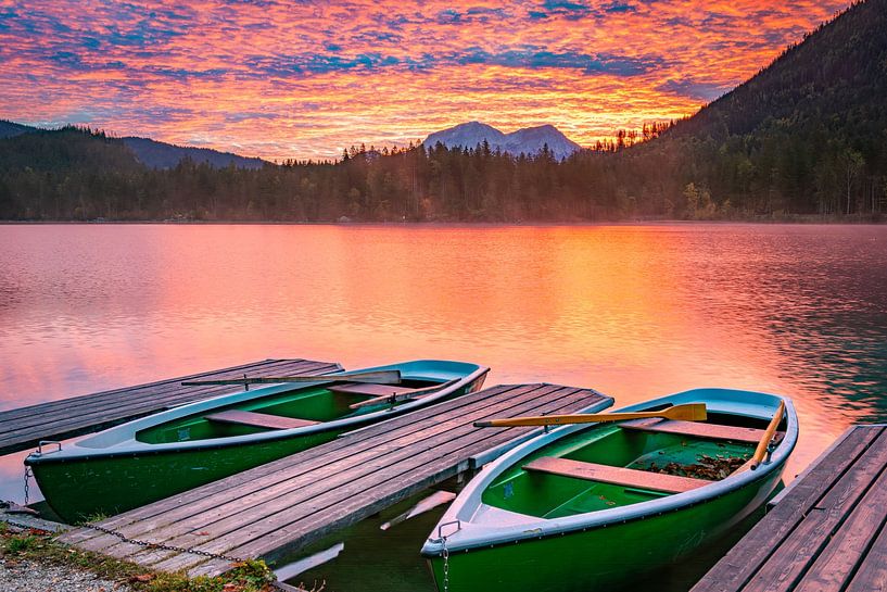 Un lever de soleil de rêve sur le lac Hintersee dans les Alpes de Berchtesgaden. Les bateaux guident le regard à travers le lac vers le mont Hoher Göll sous un magnifique ciel matinal.