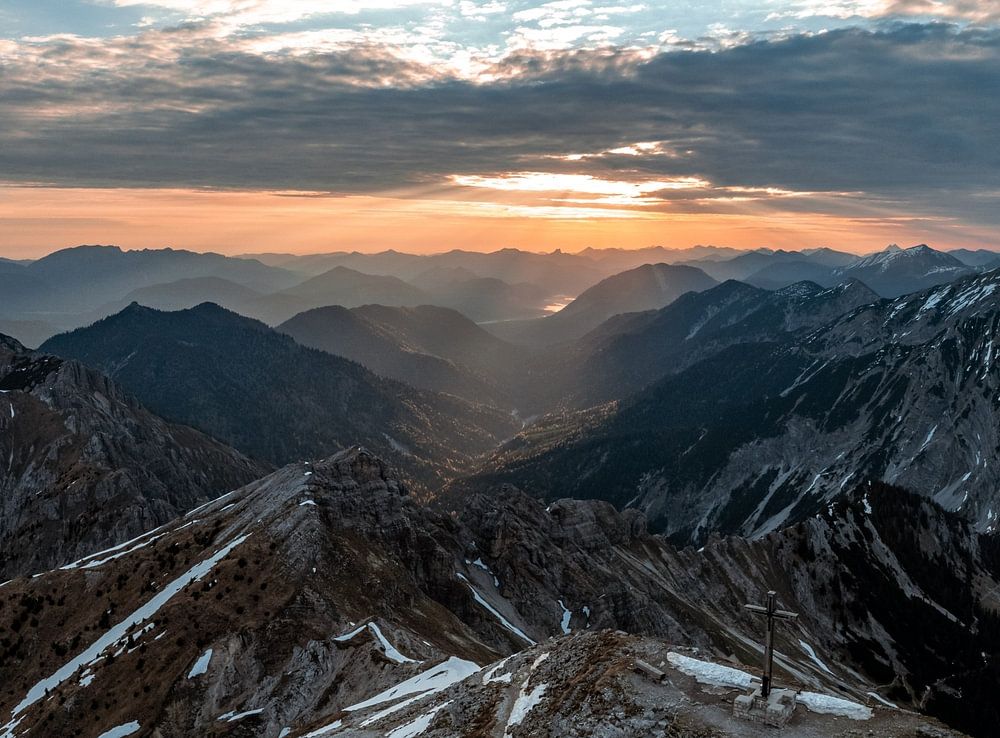 Lever de soleil sur les Alpes de Haute-Bavière et le Walchensee