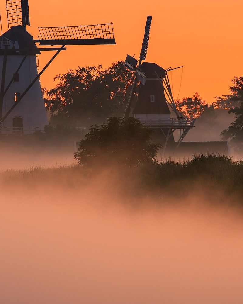 Lever du soleil à Ten Boer, dans la province de Groningue, aux Pays-Bas. Le brouillard se couche tôt le matin sur la terre et sur le canal Damsterdiep qui surplombe la Witte Molen et le moulin de Bovenrijge.