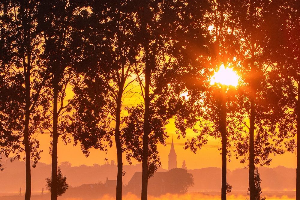 Le soleil brillait entre les arbres et illuminait la rosée du matin, avec la silhouette de l'église de Hernen au loin.