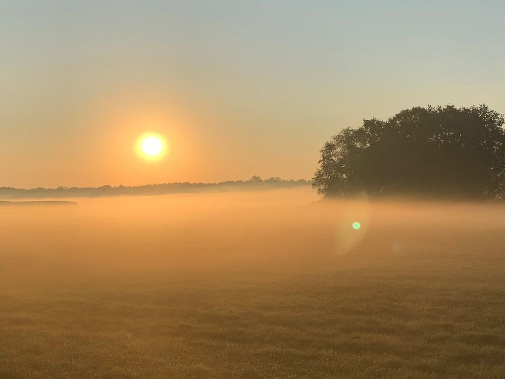 Magnifique lever de soleil avec brume et brouillard sur une prairie au petit matin.