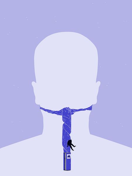 Le graphisme numérique montre un avatar Internet avec une bande adhésive anti-mouches nouée autour de la moitié inférieure de son visage, à l'extrémité inférieure de laquelle est collée une petite silhouette humaine. Le dessin surréaliste se veut minimaliste. La tête silhouettée de l'avatar contraste avec le détail minutieux de la…