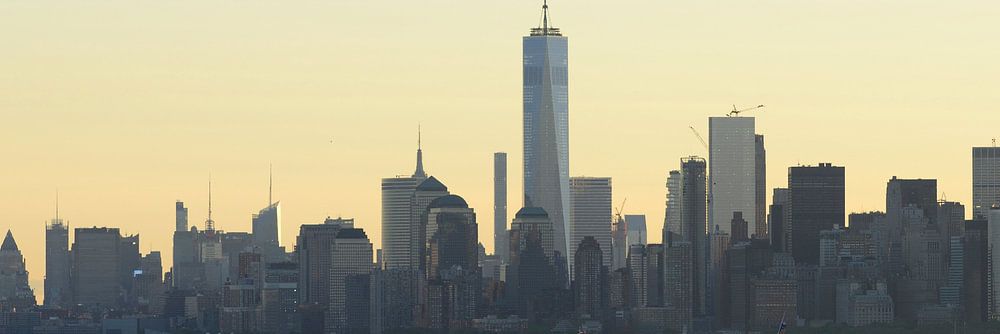 La ligne d'horizon de Manhattan au matin, vue de Staten Island. Le bâtiment le plus haut est le One World Trade Center. À gauche, vous pouvez voir la Statue de la Liberté.