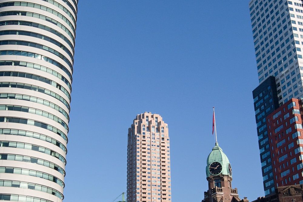 Ligne d'horizon de Rotterdam avec vue sur l'hôtel New York, le centre du port mondial et la Nouvelle-Orléans.