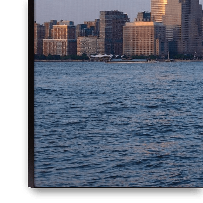 Ligne d'horizon du Lower Manhattan à New York pendant le coucher du soleil. Au premier plan, le fleuve Hudson. Le bâtiment le plus haut est le One World Trade Center.