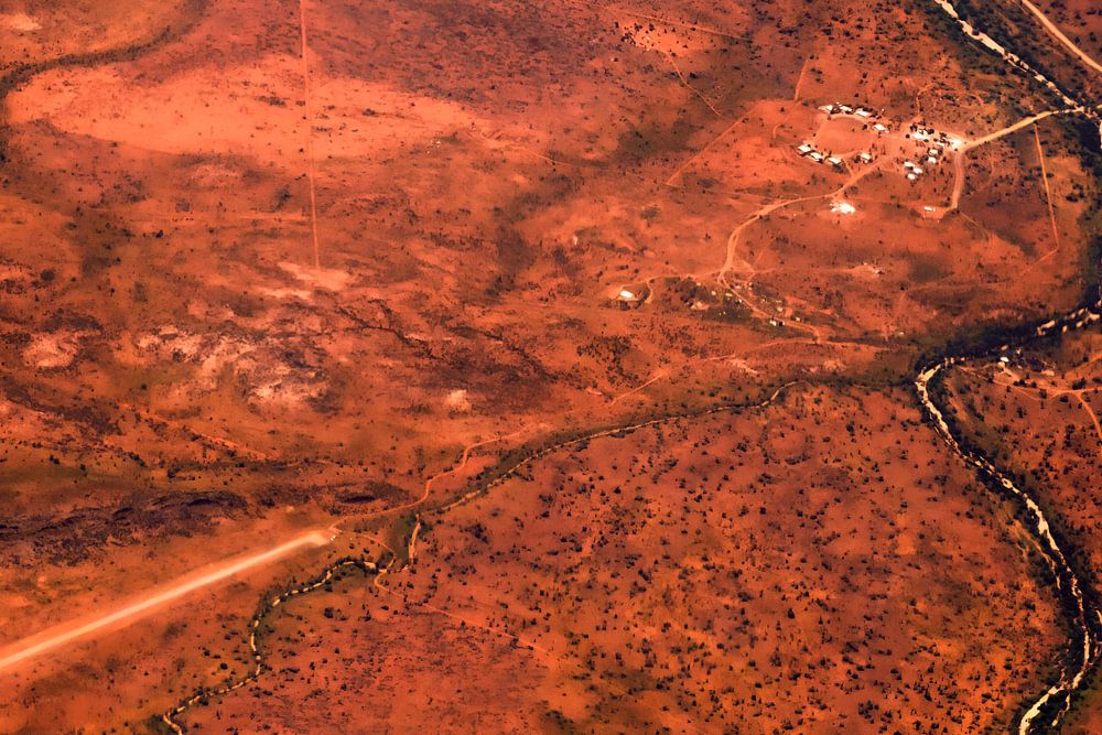 Une vue fascinante d'un cours d'eau étroit et sinueux qui coule comme une bouée de sauvetage à travers un vaste paysage couleur rouille. La forme organique de la rivière contraste fortement avec la texture rugueuse du terrain environnant. Les tons chauds et intenses de la terre suggèrent une teneur élevée en fer, typique des formations géologiques anciennes. Des bandes plus claires sont visibles sur les bords de l'eau, là où les minéraux se sont déposés pendant les inondations et les sécheresses. Cette image illustre la relation essentielle entre l'eau et la terre dans les climats arides, où même les plus petits écoulements d'eau sont essentiels à l'écosystème et forment un motif visuellement impressionnant.